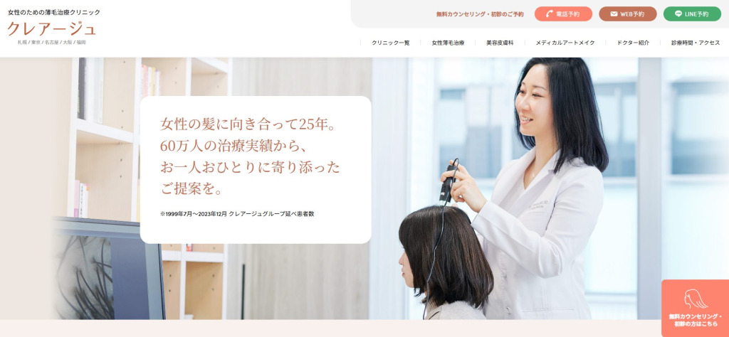クレアージュは、女性専門の発毛治療クリニックとして長年の実績があるタイプで、女性の薄毛に特化した視点で相談できるのが強みです。薄毛の原因が複合的になりやすい女性にとって、「薄毛だけを切り取らずに整理してもらえる」安心感があります。