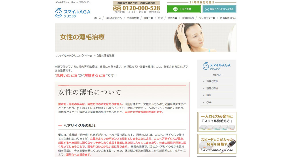 女性薄毛に特化し、体調や生活背景も含めて整理しながら進めたい人に向きます。寄り添いながら相談したい人にも合いやすいです。 - スマイルAGAクリニック