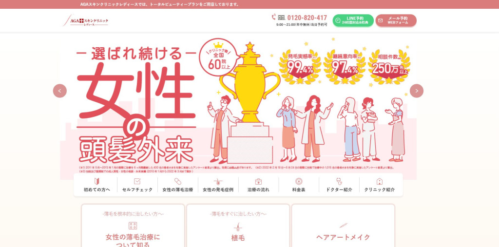 女性薄毛治療の大手として全国に多数展開しており、通いやすさの選択肢が多いのが魅力です。初めて薄毛治療を考える人にとっても、知名度があるぶん安心材料になりやすいタイプです。