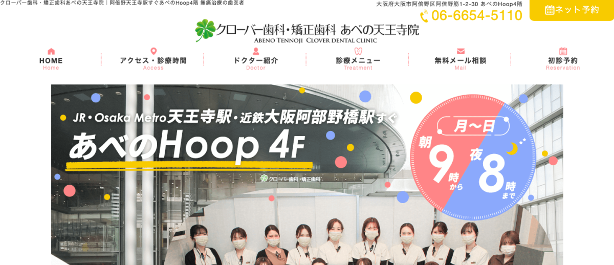 - JR・Osaka Metro天王寺駅徒歩圏内の「あべの Hoop」4階に位置。診療時間9:00~20:00(日祝除く)、ネット予約対応。