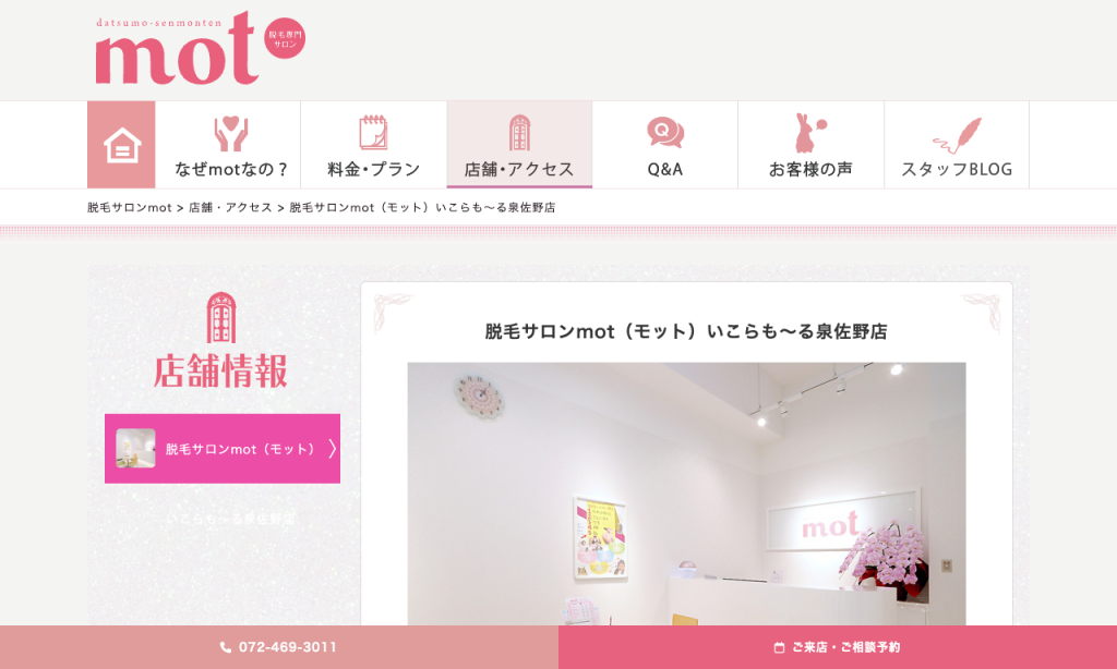 脱毛サロンmot いこらもーる泉佐野店 | 国産の高性能脱毛機を使用し、専門知識をもったスタッフが対応します。