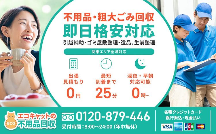 エコキャットは、東京・神奈川・千葉・埼玉を中心に活動する不用品回収・遺品整理の専門サービスです。粗大ゴミの処分やゴミ屋敷の片付け、引っ越しに伴う不要品の処理など、生活のさまざまな場面で頼れる存在として、多くの支持を集めています。スピーディーかつ丁寧な対応で、利用者の負担を軽減することを大切にしています。