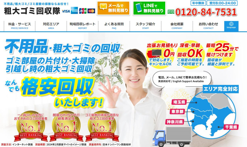粗大ゴミ回収隊は、関東エリアに特化した不用品・粗大ゴミ回収サービスです。独自のネットワークを駆使し、最短25分で駆けつける迅速さが特長で、急な引越しや片付けでもスムーズに対応できます。見積もりや出張費用は一切かからず、金額に納得してから作業を始めるため、安心感があります。さらに英語対応スタッフも在籍しており、日本語に不安のある外国人の方にも利用しやすい環境を整えています。
