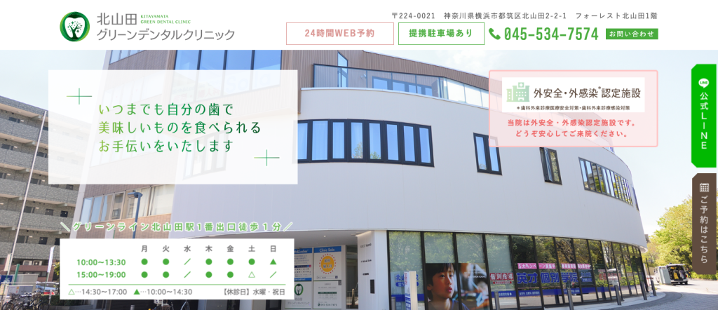 - グリーンライン北山田駅から徒歩1分。待合室・診察室にキッズスペース完備、個室診療室(ファミリールーム)あり。平日19:00まで、土日も診療。